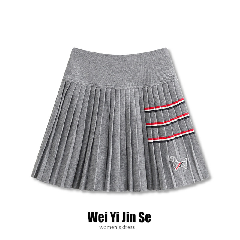 韩版tb小狗刺绣韩版条纹学院风减龄针织百褶裙女半身裙短裙秋冬款