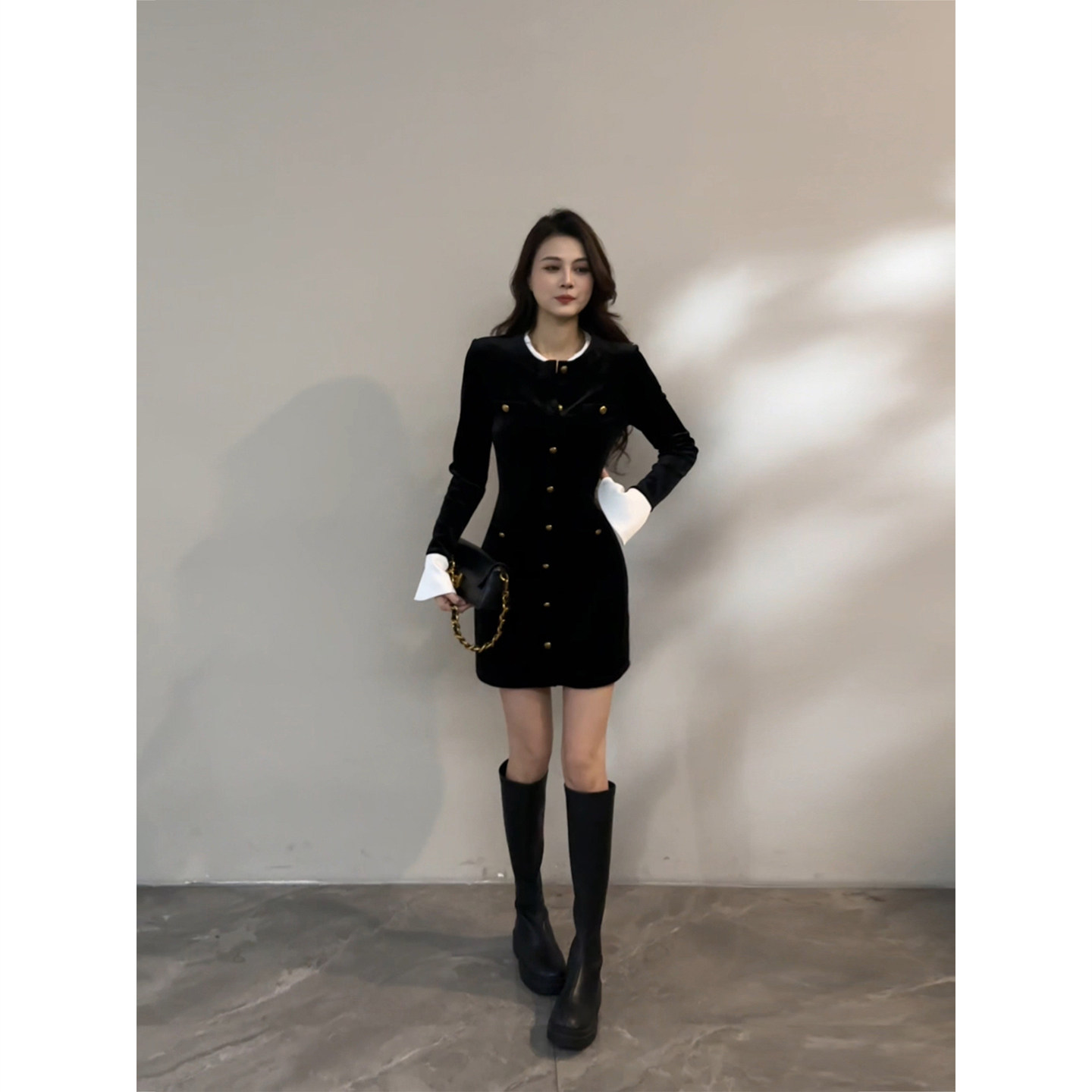 大婷婷 时尚拼接黑白撞色纽扣短裙秋冬新款绒感长袖连衣裙DT1881