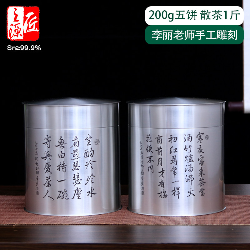 匠之源小五子锡罐纯锡茶罐小五饼茶缸200g茶饼5饼李丽老师手刻
