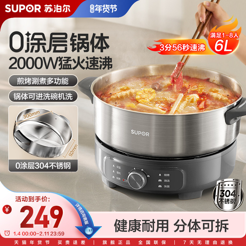 苏泊尔电火锅家用0涂层大火力速沸可分体多功能6L大容量料理锅