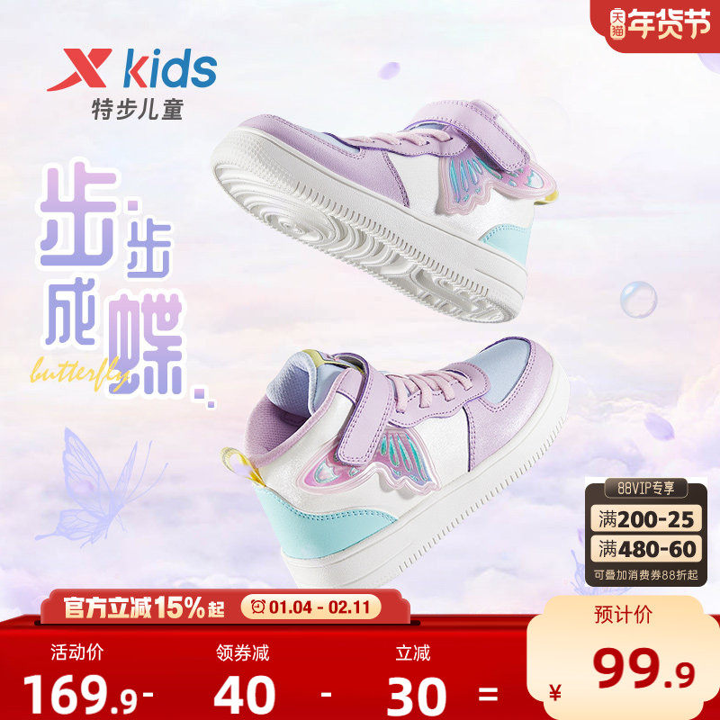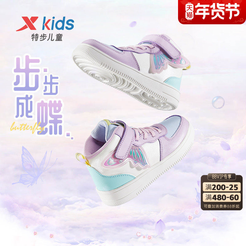 特步儿童2025年春季新款女小童鞋子运动鞋女孩休闲高帮板鞋滑板鞋
