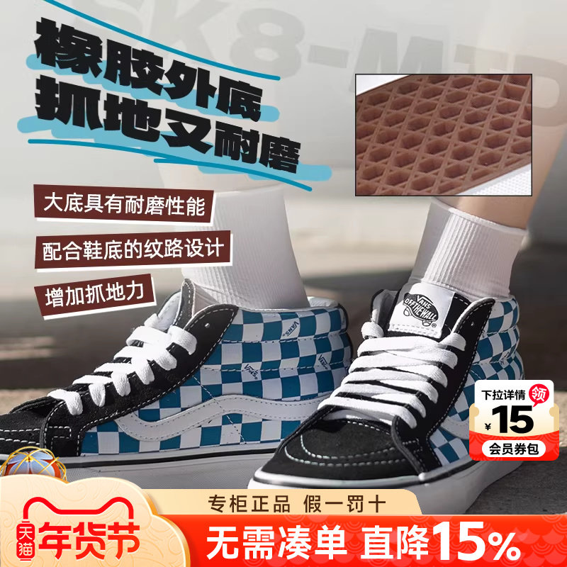 VANS范斯男女鞋SK8-Mid经典蓝白棋盘格舒适休闲鞋中帮板鞋滑板鞋