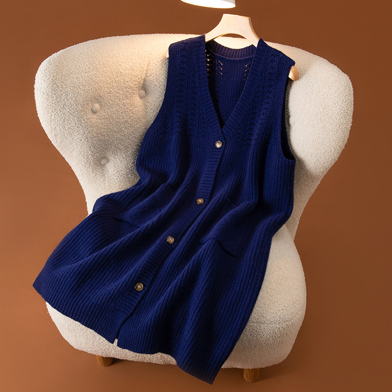 羊范软糯亲肤~100%纯羊毛针织马甲开衫女士V领中长款镂空加厚外套