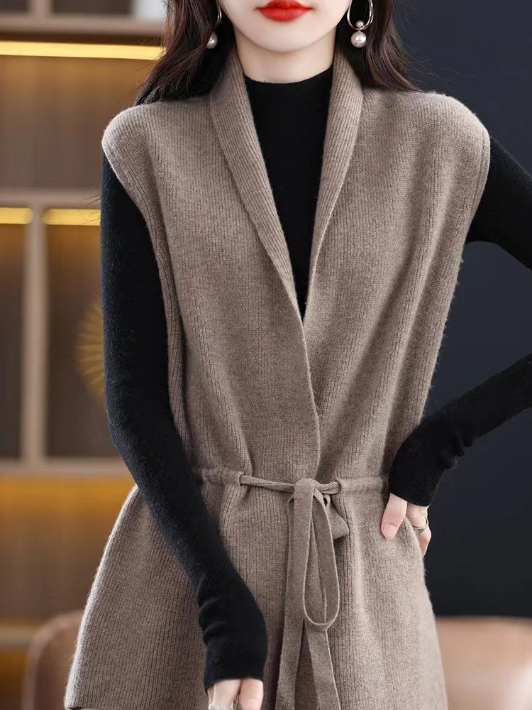 2025秋冬新款100%纯羊毛马甲开衫女V领系带中长款背心宽松针织衫