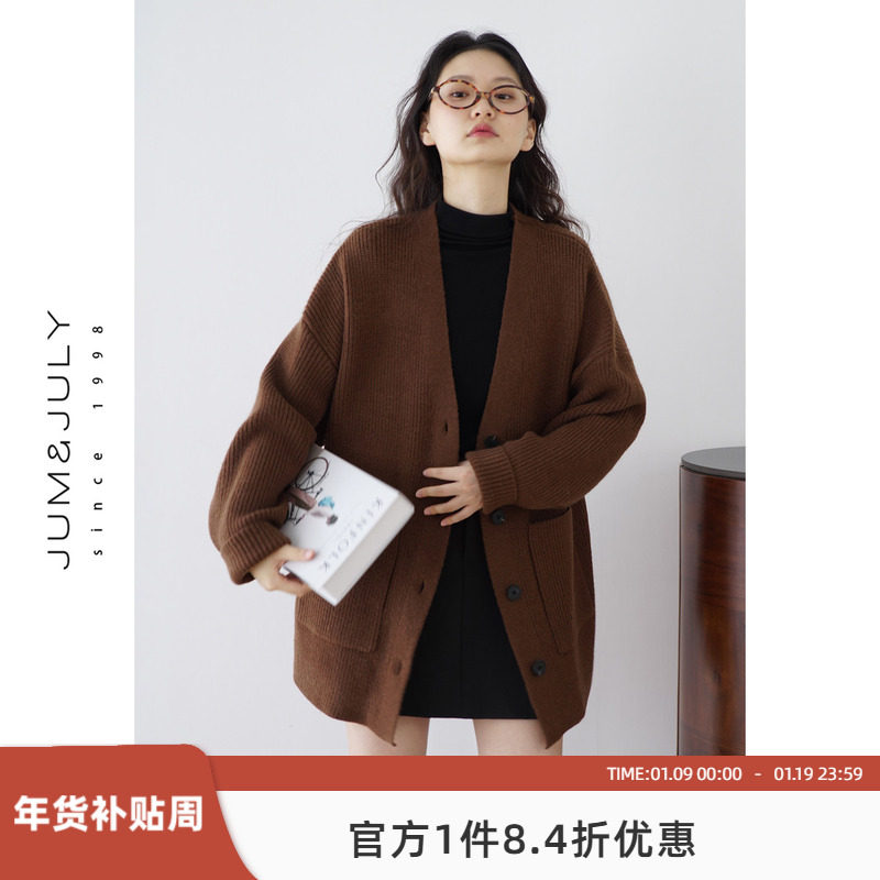 嘉茱莉中长款针织开衫外套女2025秋季新款宽松上衣V领毛衣毛衫
