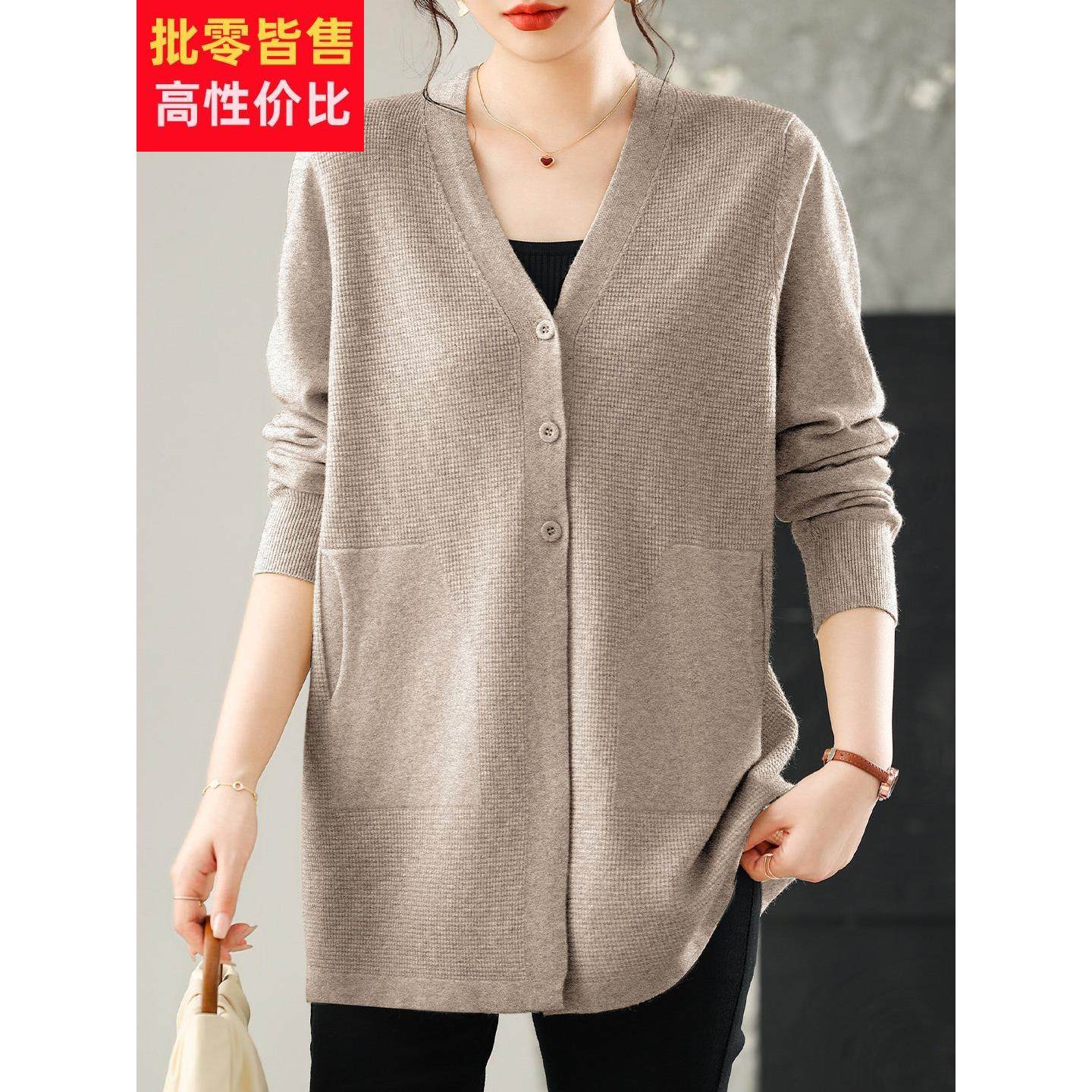女士秋季中长款宽松毛针织衫显瘦外套开衫V领毛衣防晒衫长袖薄款