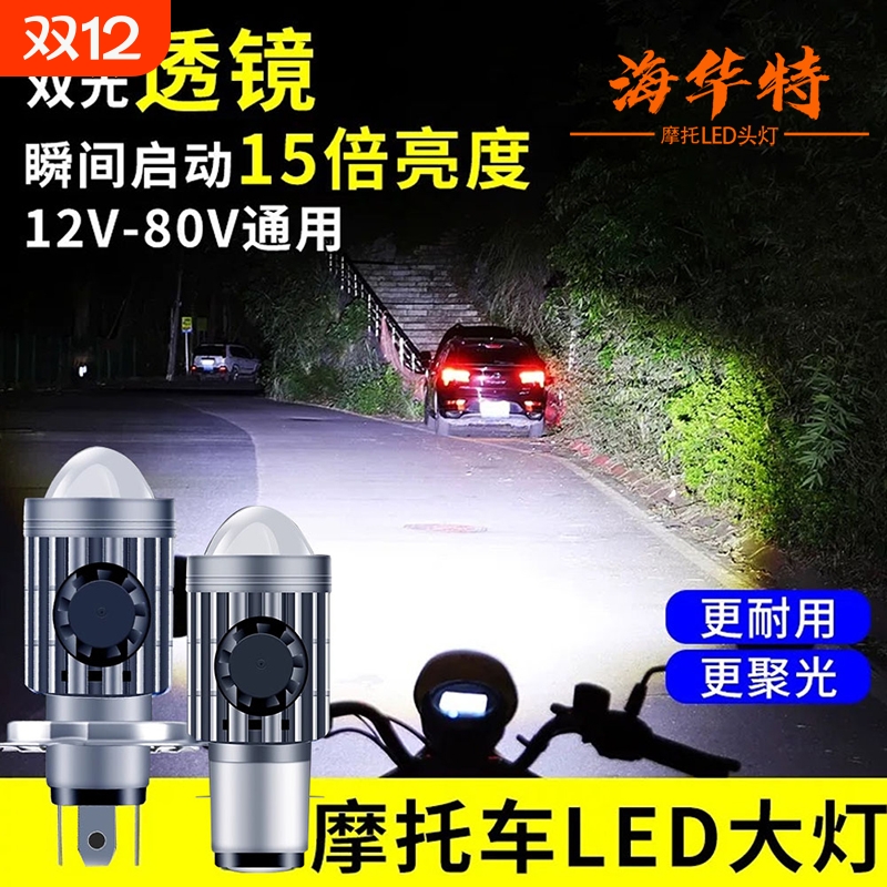 摩托车灯强光前大灯双爪三爪led灯泡12v激光灯12-80V电动车透镜灯
