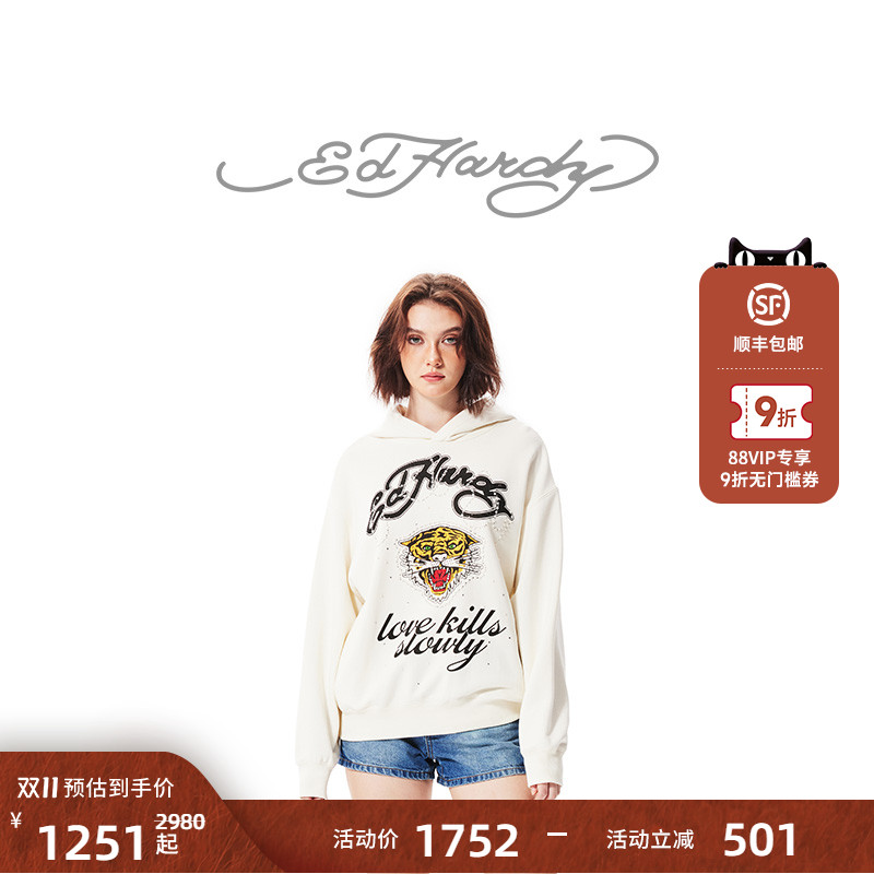 Ed Hardy埃德哈迪秋季新款连帽宽松短款长袖女士拉链开衫卫衣