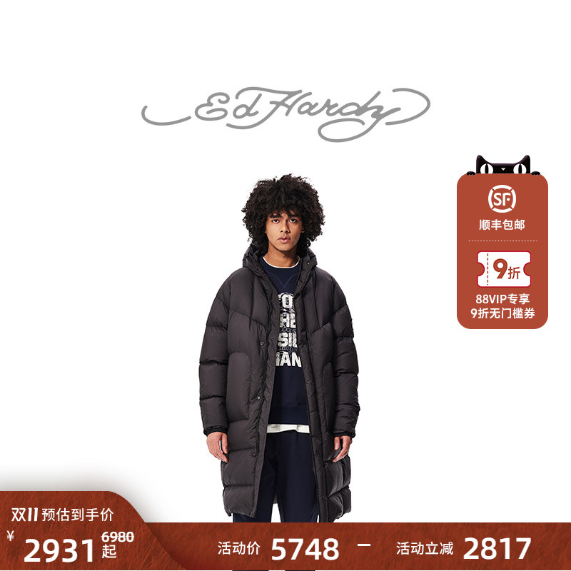 Ed Hardy埃德哈迪冬季新款男士中长款羽绒服纯色时尚保暖外套