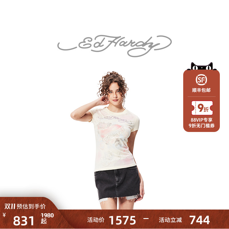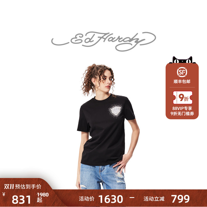 Ed Hardy埃德哈迪冬季新款水浆印烫钻圆领修身女士短袖T恤