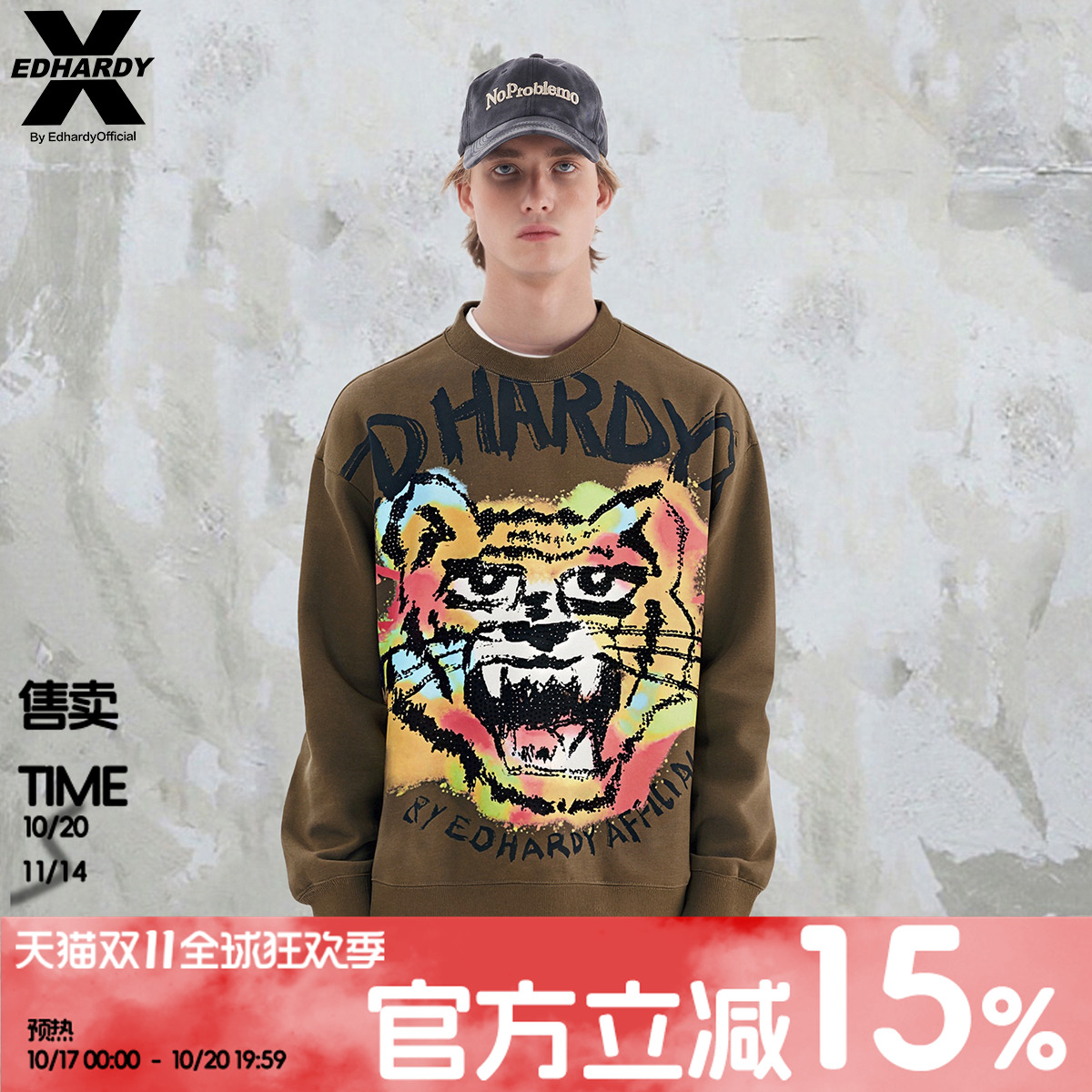 EDHARDY X2025秋季新款涂鸦咆哮虎头烫钻印花圆领国潮设计感卫衣