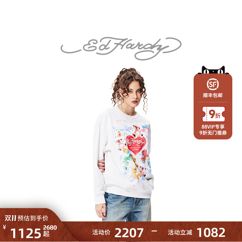 Ed Hardy埃德哈迪冬季新款水浆印烫钻宽松休闲女士套头衫卫衣