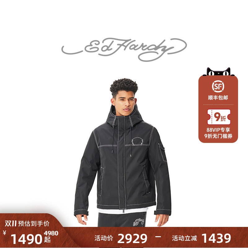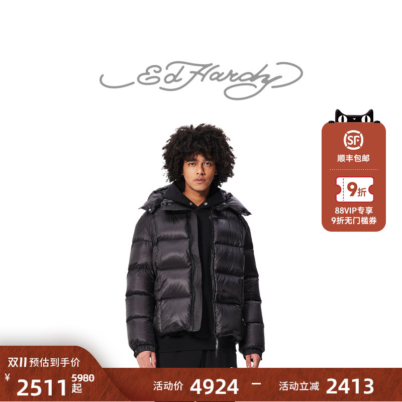Ed Hardy埃德哈迪冬季新款男士90白鸭绒羽绒服连帽保暖外套