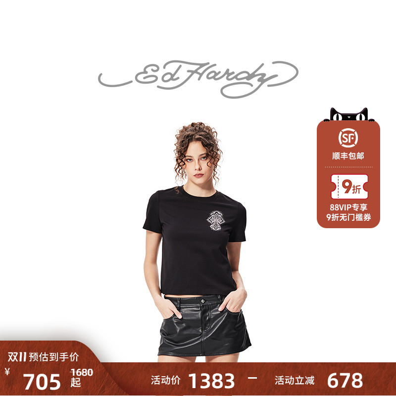 Ed Hardy埃德哈迪冬季新款十字架拔印烫钻紧身女士短袖T恤