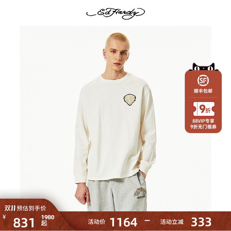 Ed Hardy埃德哈迪潮流新款植绒金葱印logo男士长袖T恤