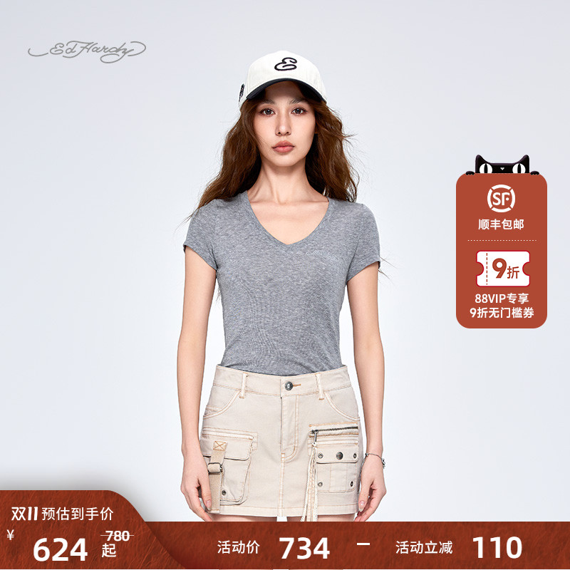 Ed Hardy埃德哈迪2025夏季新款烫钻轻薄透气复古v领女士短袖T恤