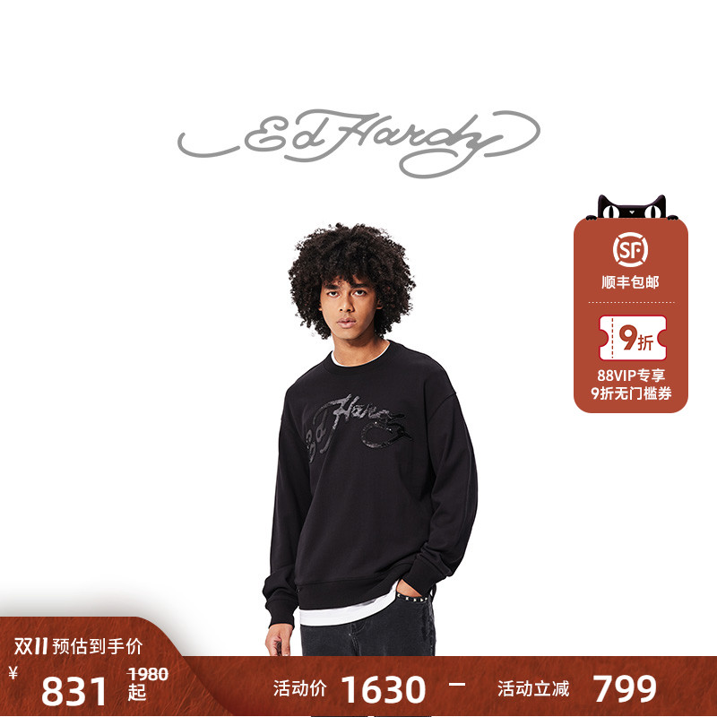 Ed Hardy埃德哈迪冬季新款男士美式套头衫珠片绣logo圆领卫衣