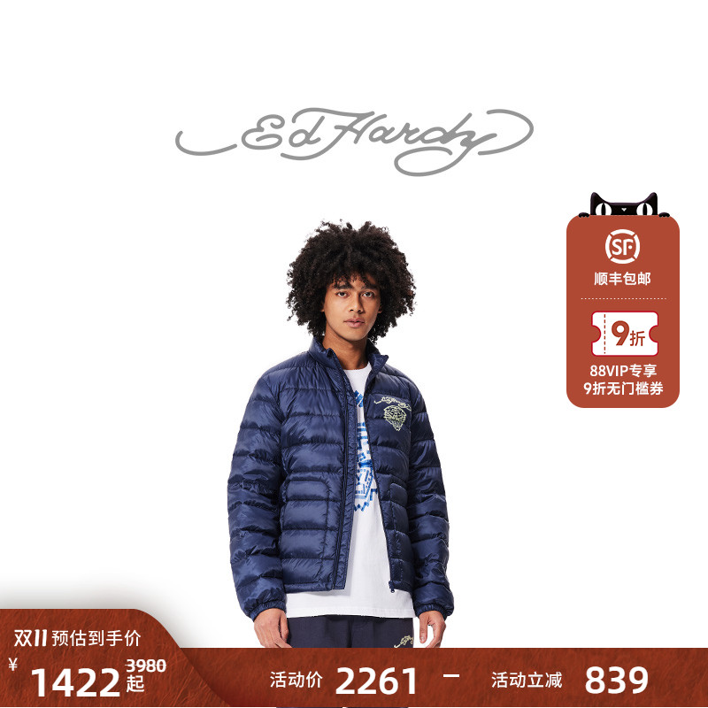 Ed Hardy埃德哈迪冬季新款男士美式羽绒服绗线绣花虎头保暖外套
