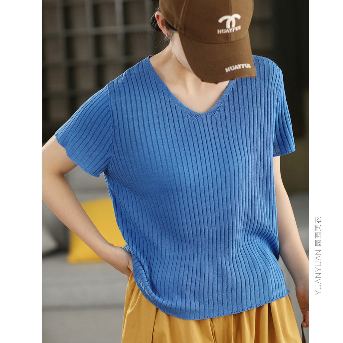 园园美衣复古天丝亚麻针织短袖女夏季坑条显瘦V领套头衫百搭T恤