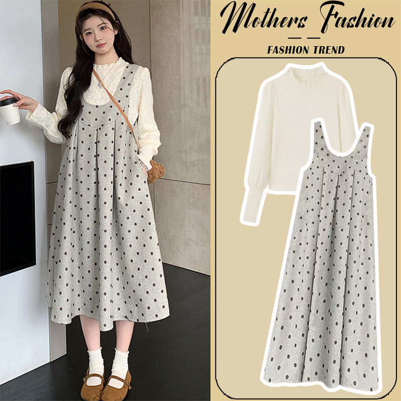 孕妇连衣裙秋冬款洋气减龄高级感孕妇装宽松波点毛呢背带裙两件套