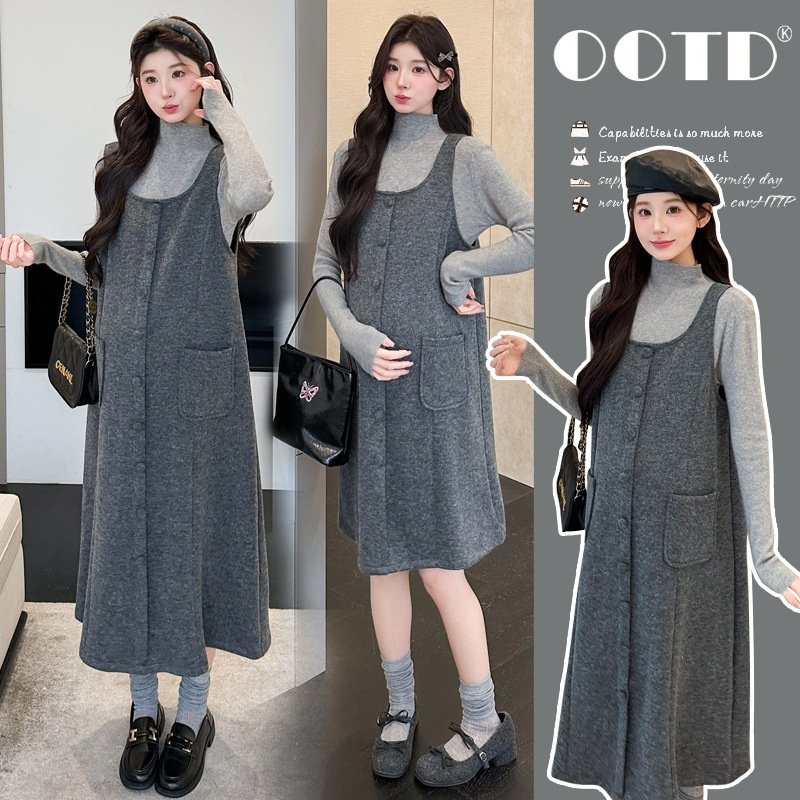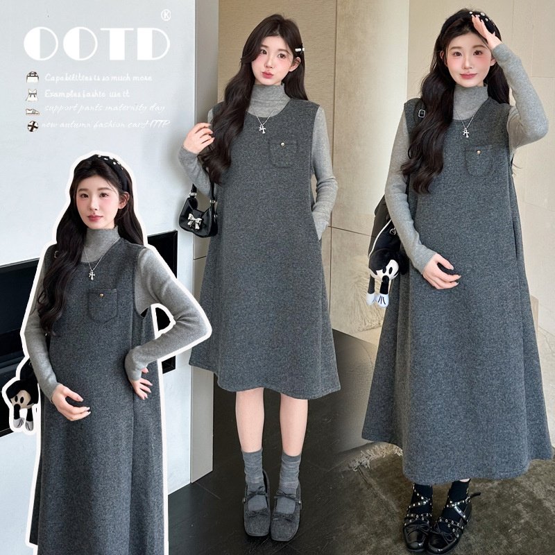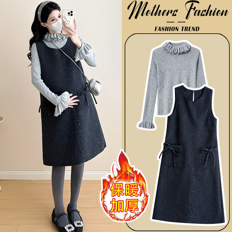 孕妇连衣裙套装秋冬2025新款灰色潮妈毛呢加厚背心裙打底衫两件套