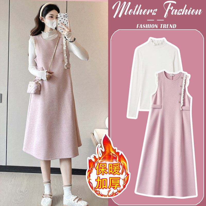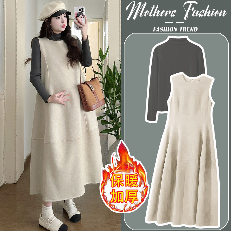 孕妇连衣裙套装秋冬2025新款韩版加厚毛呢遮肚背心裙打底衫两件套