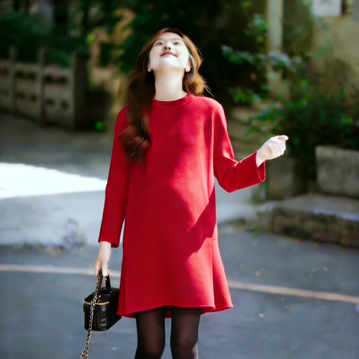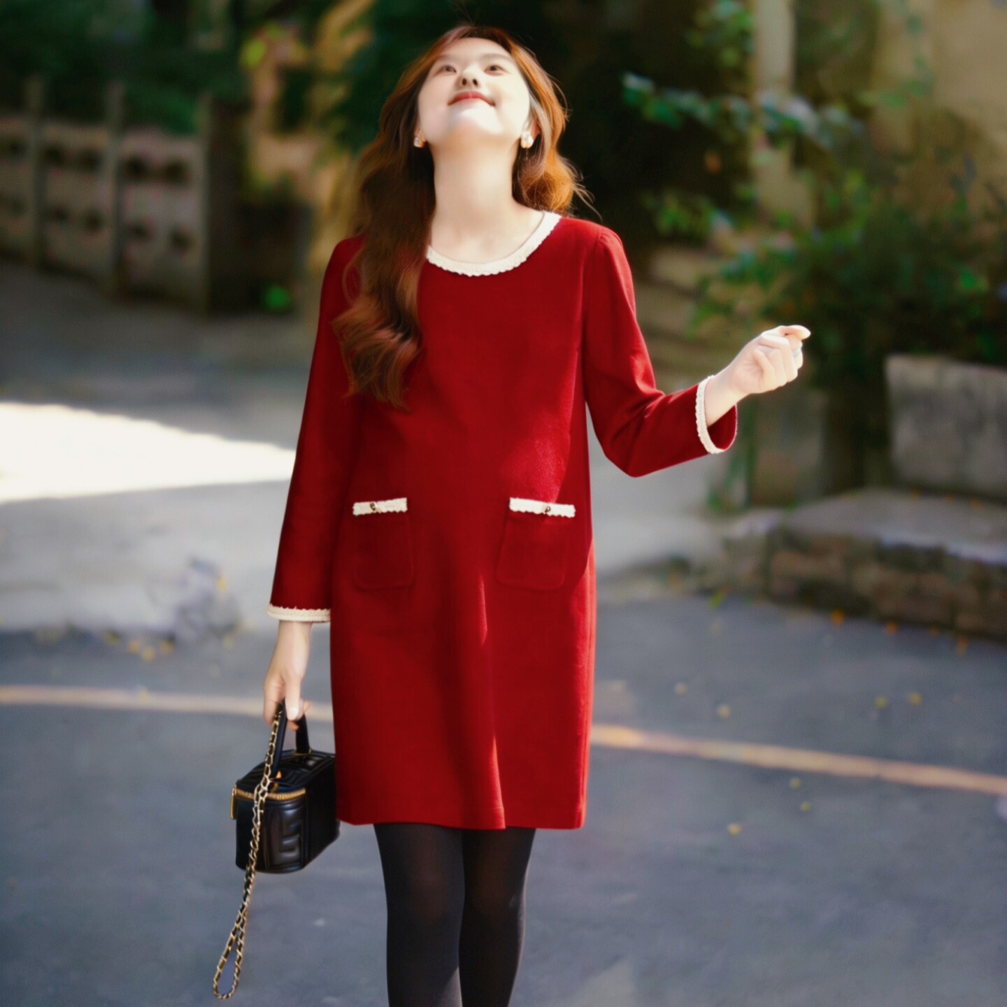 孕妇装2025新款冬装打底内搭红色连衣裙加厚孕妈法式连衣裙毛呢裙