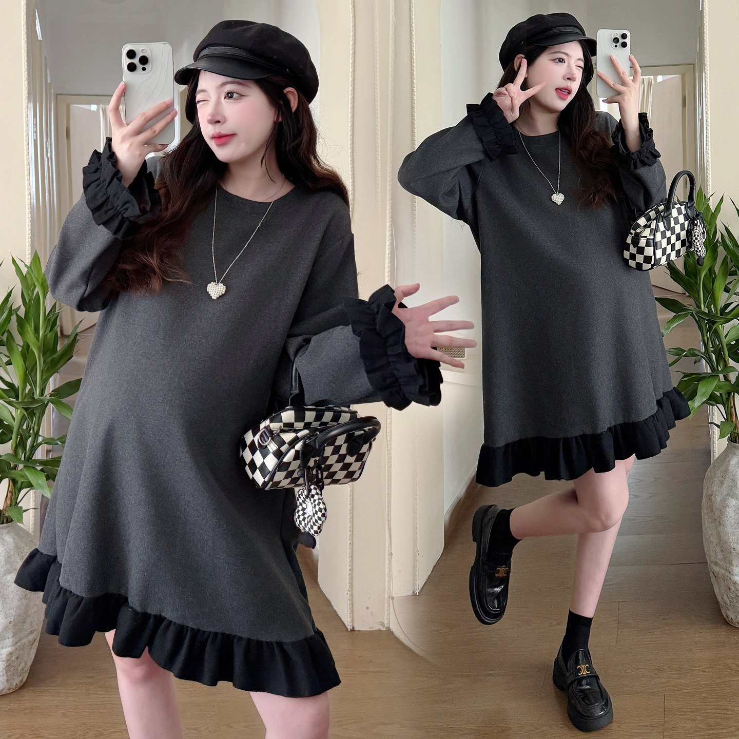 大码孕妇连衣裙2025秋冬新款设计感拼接花边毛呢裙减龄显瘦200斤