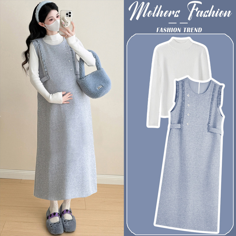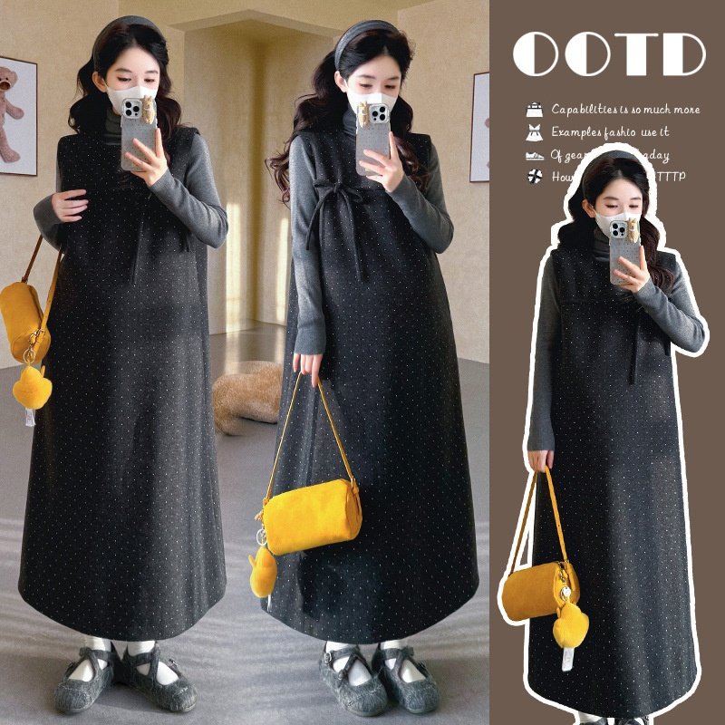 孕妇连衣裙套装2025新款高级感潮妈毛呢背心裙打底衫两件套秋冬季