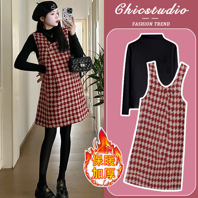 孕妇连衣裙秋冬2025新款宽松韩版红格孕妈不显怀毛呢背心裙两件套