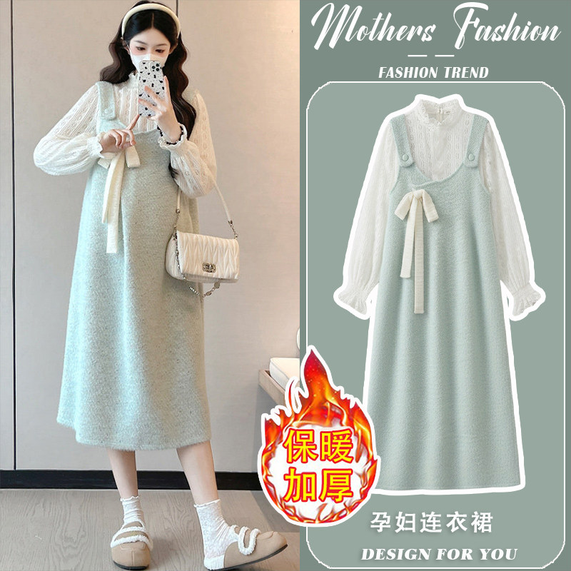 孕妇连衣裙套装秋冬2025新款浅绿蝴蝶结毛呢背带裙打底衫两件套女
