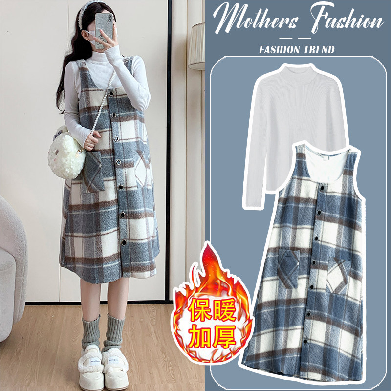 孕妇背带裙秋冬两件套韩版格子毛呢裙+打底衫时尚减龄孕妇连衣裙