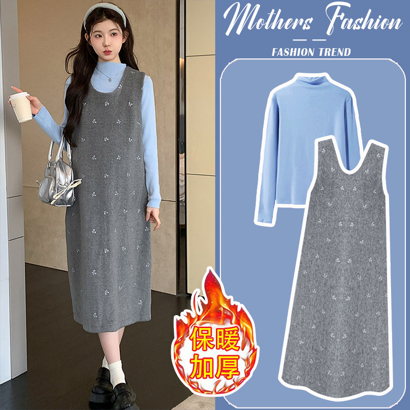 孕妇连衣裙套装秋冬2025新款灰色潮妈加厚毛呢背带裙打底衫两件套