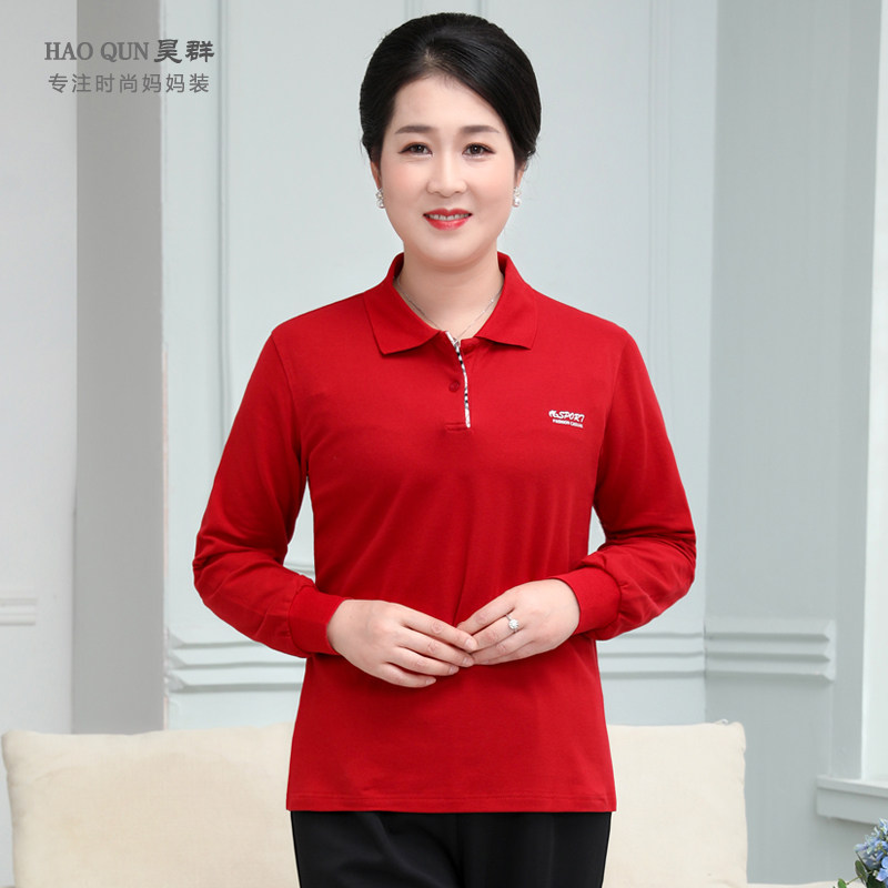 昊群妈妈春秋装长袖纯棉t恤女中老年翻领polo打底衫运动上衣定制
