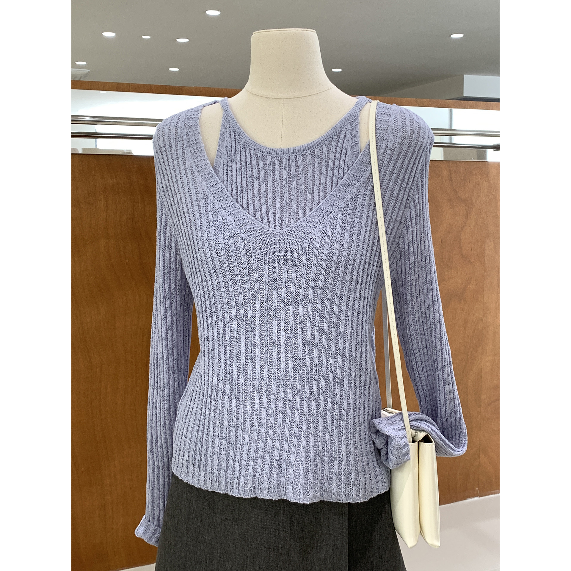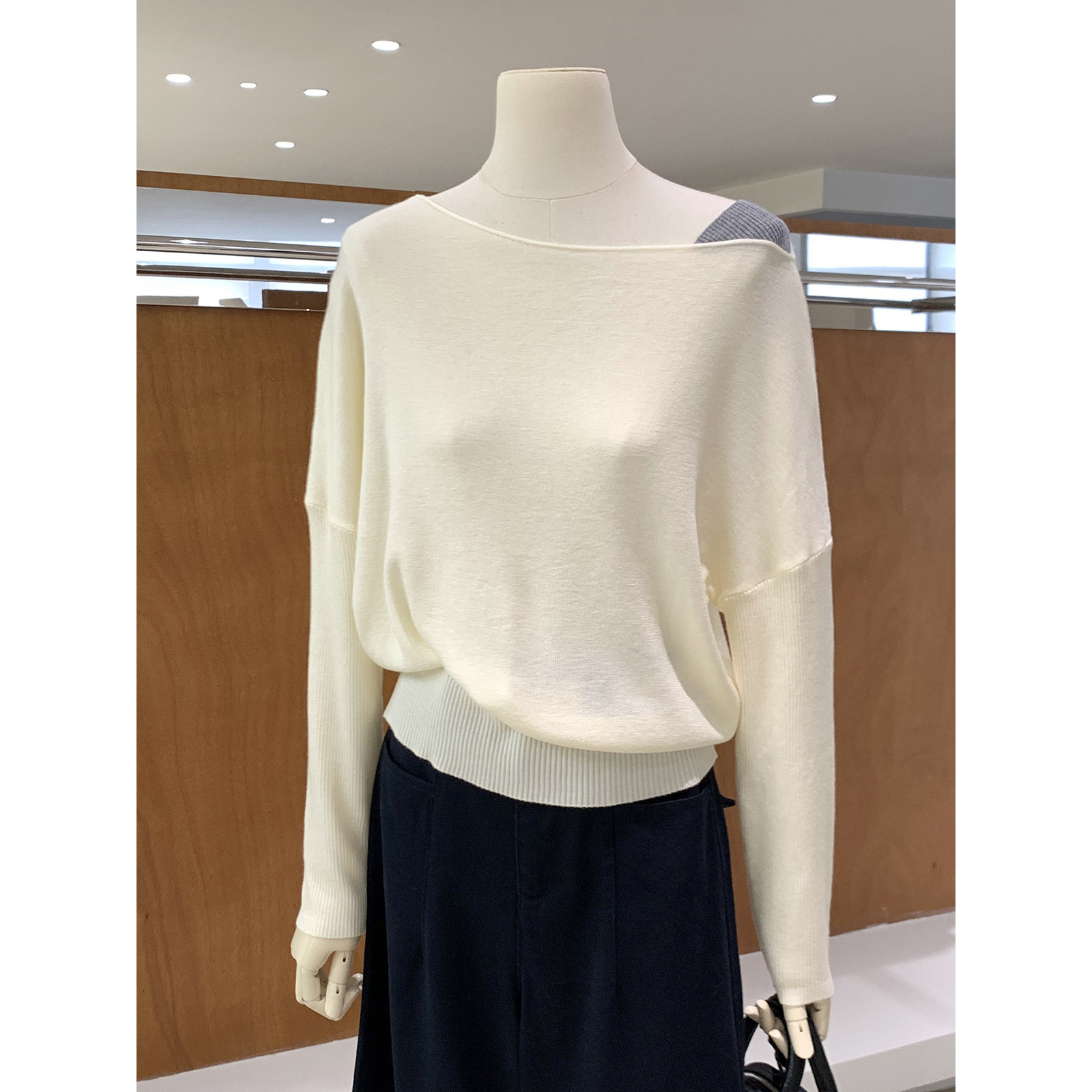 NO INFO 为杂志撰稿的女人 精纺修身两穿一字露肩针织衫早秋上衣