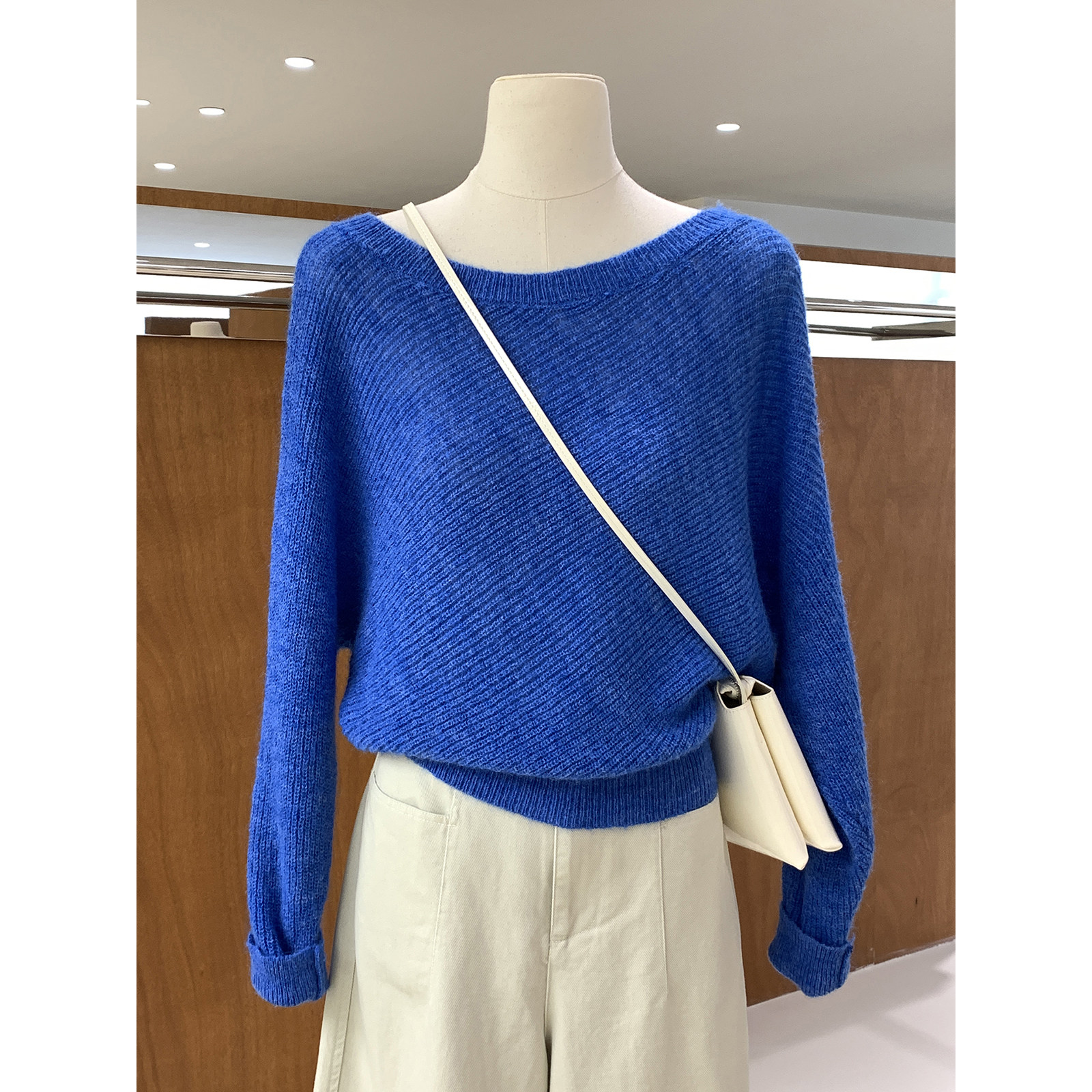 慵懒韩系温柔不规则斜肩长袖针织衫2026春季新款蝙蝠袖女人衫上衣