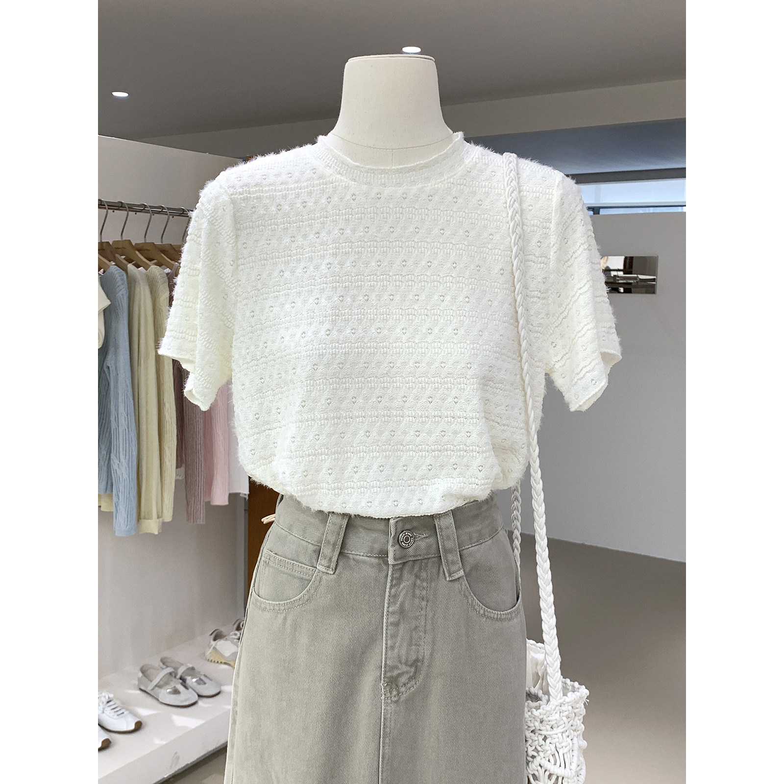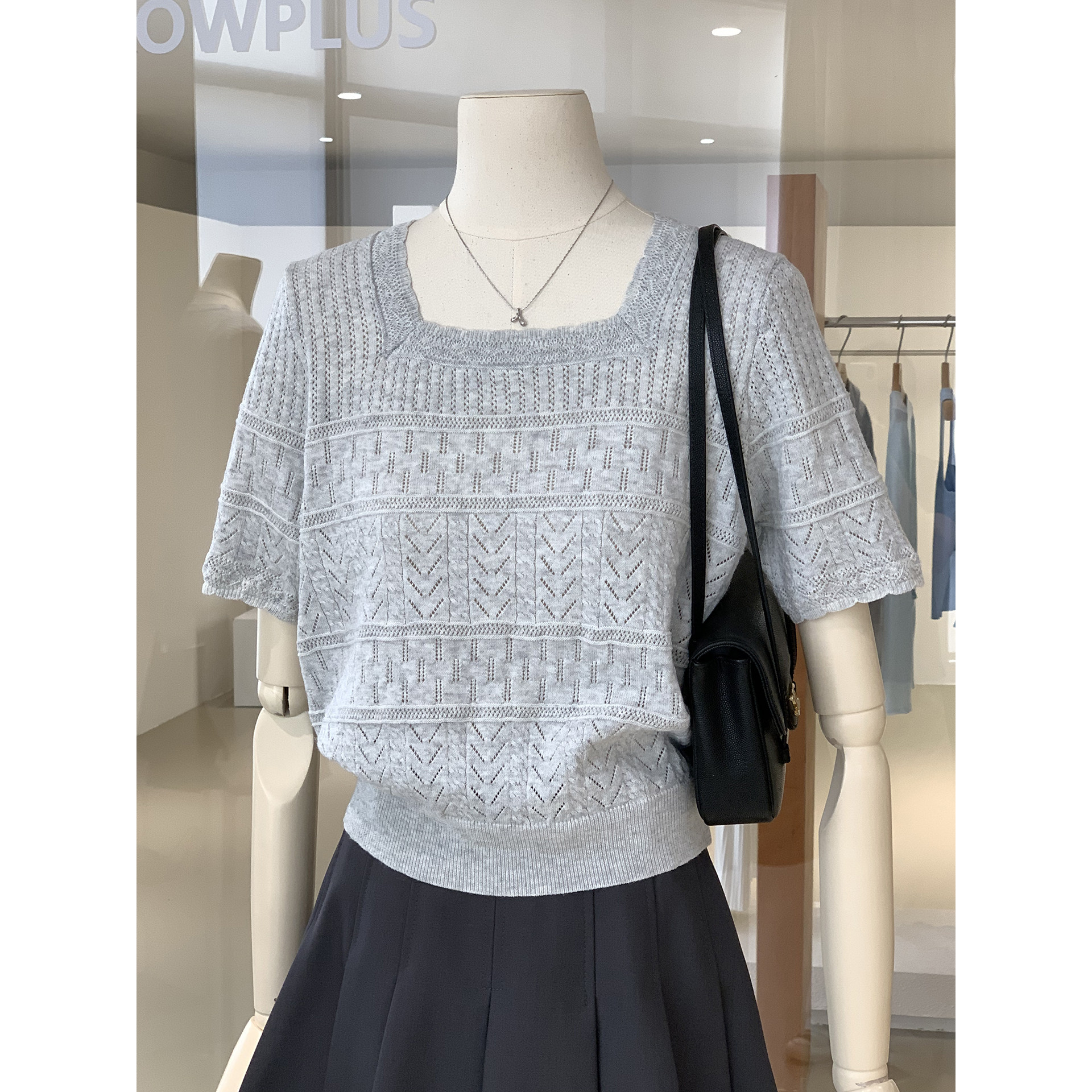 温柔气质方领镂空钩花短袖针织衫2026春季新款通勤百搭精致女人衫