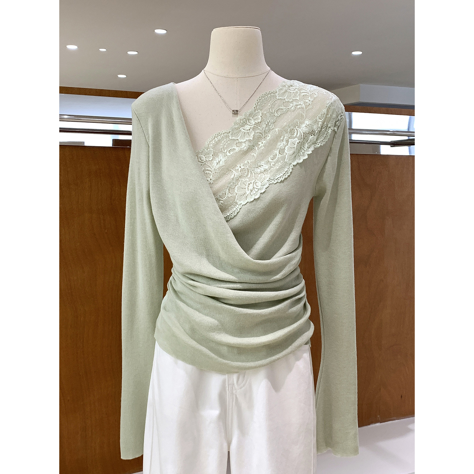 温柔轻熟风交叉V领蕾丝拼接针织衫春新款褶皱收腰气质漂亮女人衫