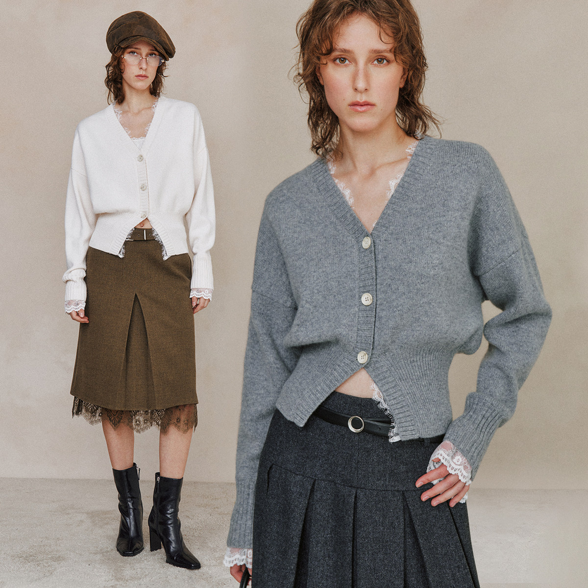 【叠穿层次】假两件设计法式精致女人味蕾丝拼接羊毛针织开衫上衣