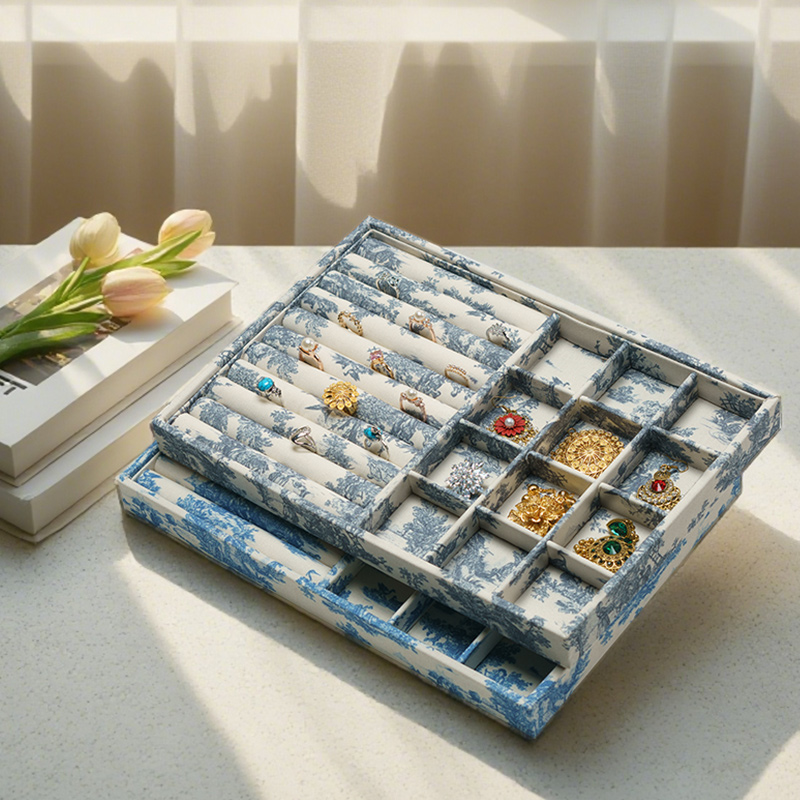 布艺法式印花复古首饰收纳盒戒指项链吊坠耳饰珠宝托盘摆摊展示架