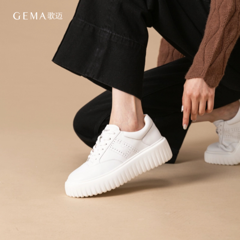 歌迈女鞋厚底休闲鞋真皮软底增高舒适小白鞋女时尚运动鞋平板鞋冬