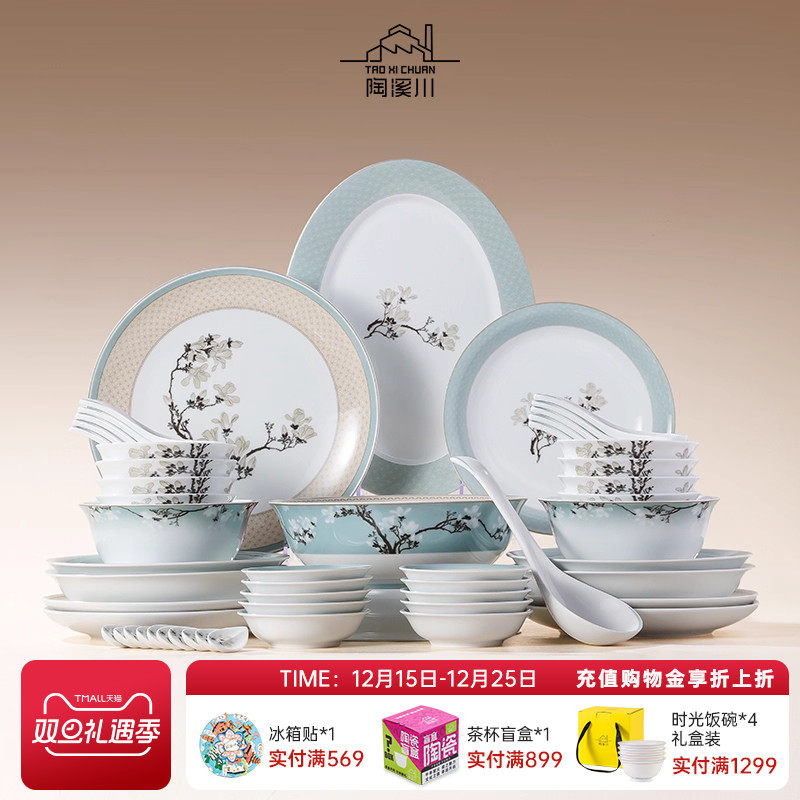 陶溪川景德镇陶瓷中国色国色可餐玉兰香56头中式家用餐具套装礼盒