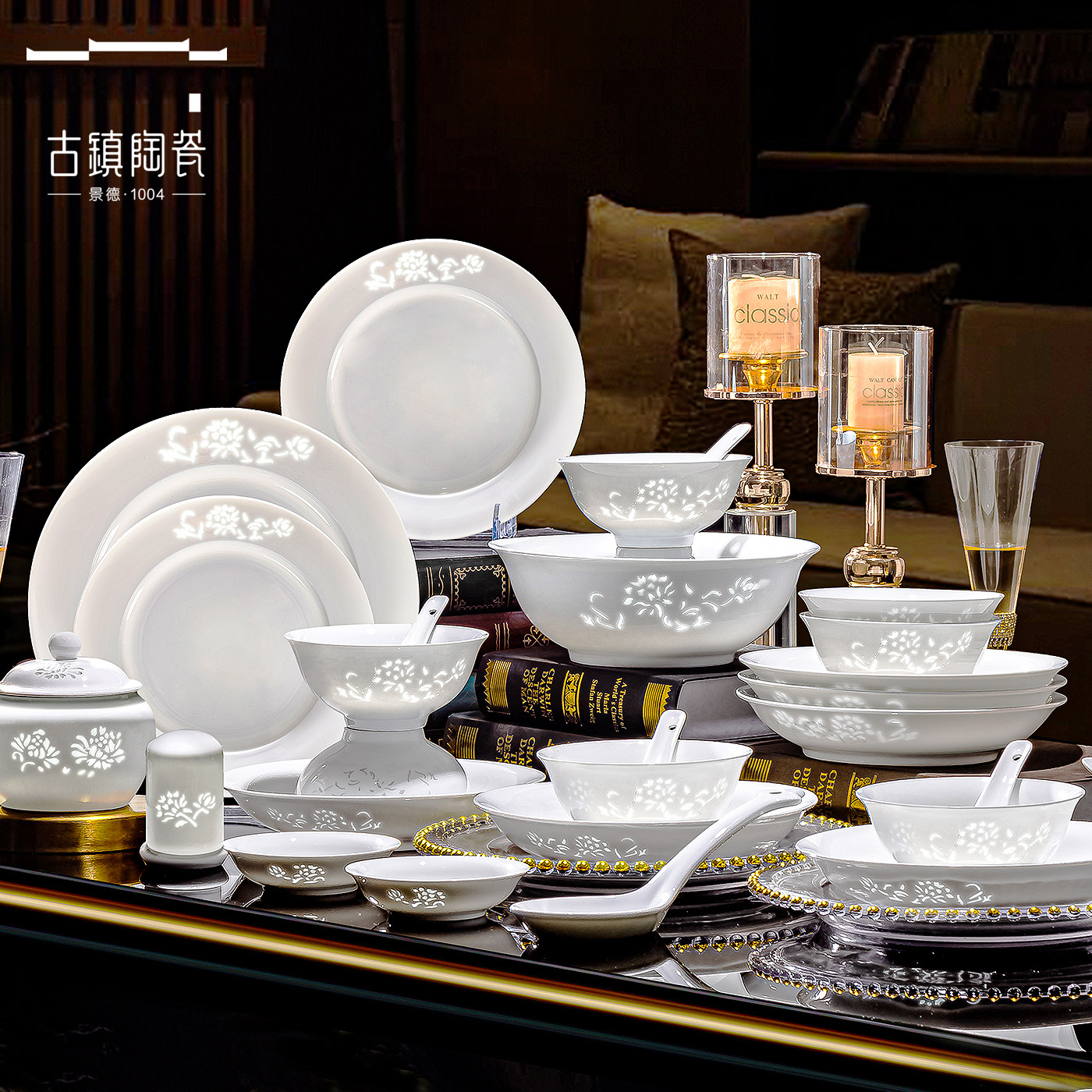 古镇陶瓷 景德镇56头餐具套装礼盒 结婚乔迁礼 10人碗碟盘勺套组
