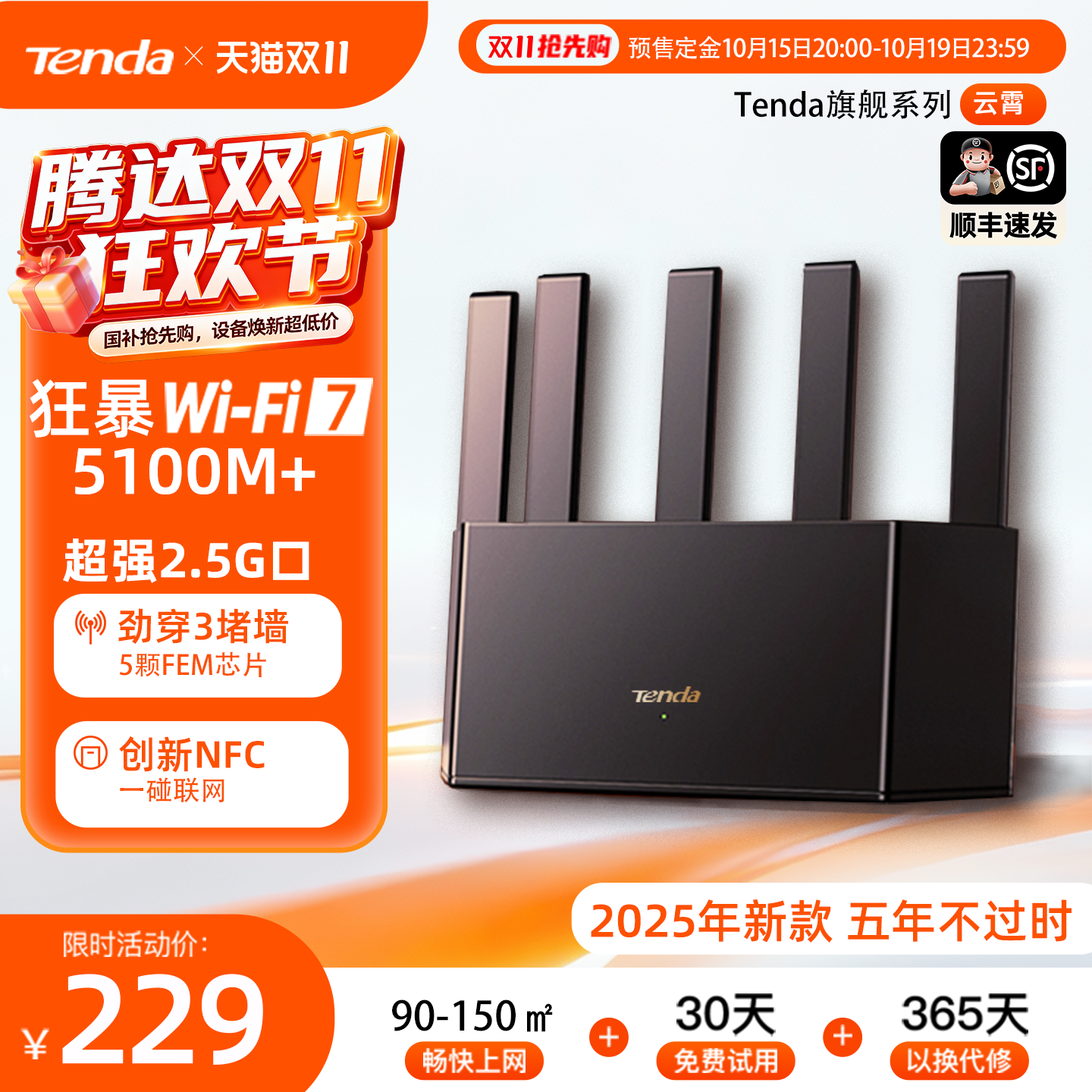 Tenda腾达路由器WiFi7【顺丰极速发】云霄BE5100家用高速千兆穿墙王无线2.5G口5G双频mesh2025新款BE6LPro