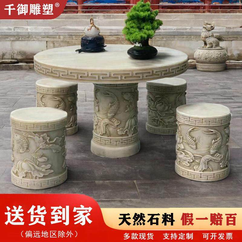 石桌石凳庭院一套汉白玉做旧茶台圆桌子室外别墅花园仿古石雕户外