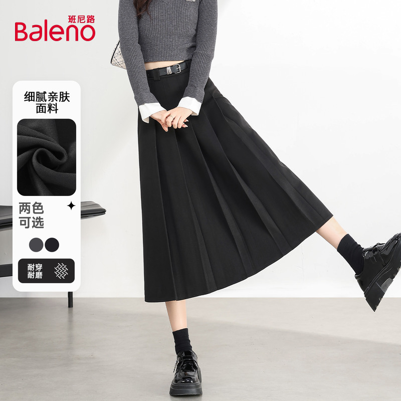 班尼路黑色毛呢百褶裙女款2025秋季新款小个子a字巨好看的半身裙H