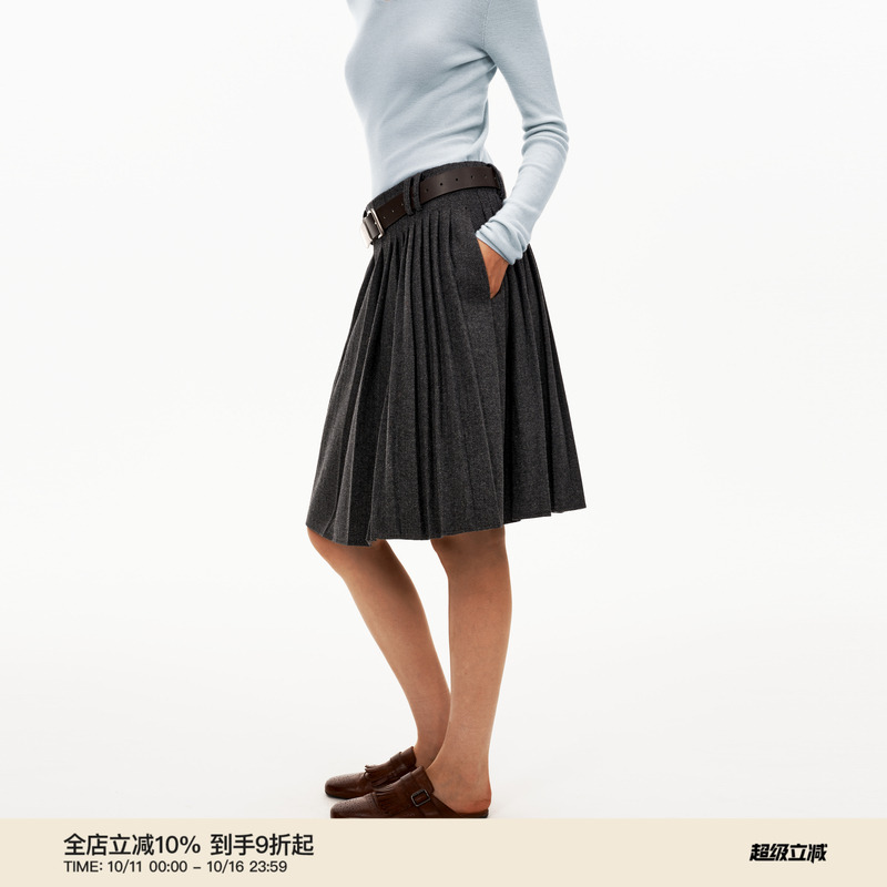班尼路灰色毛呢百褶裙女2025秋季新款中长款巨好看的a字半身裙子H
