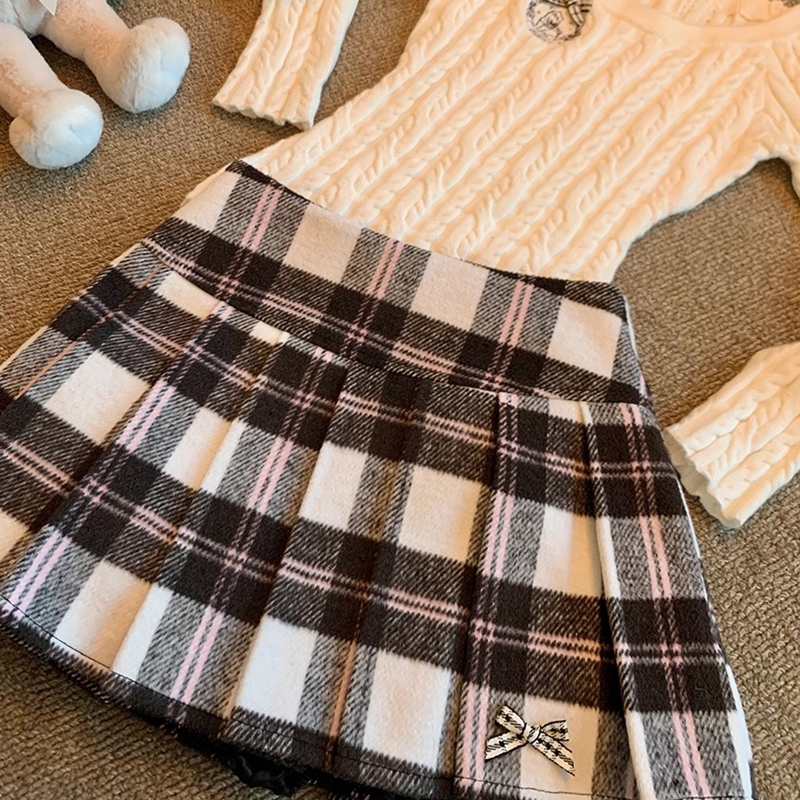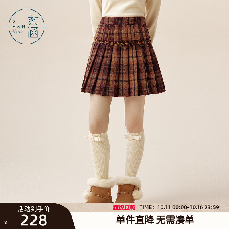 紫涵复古格纹毛呢百褶裙女冬季新款蝴蝶结甜美高腰显瘦a字短裙子