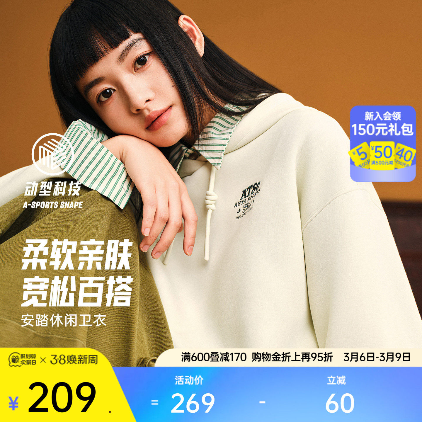 安踏休闲长袖卫衣女春季刺绣印花百搭宽松连帽运动上衣162538703