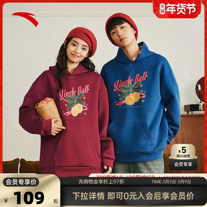 安踏连帽卫衣男女2026新款冬季加绒保暖帽衫红色宽松潮流运动上衣